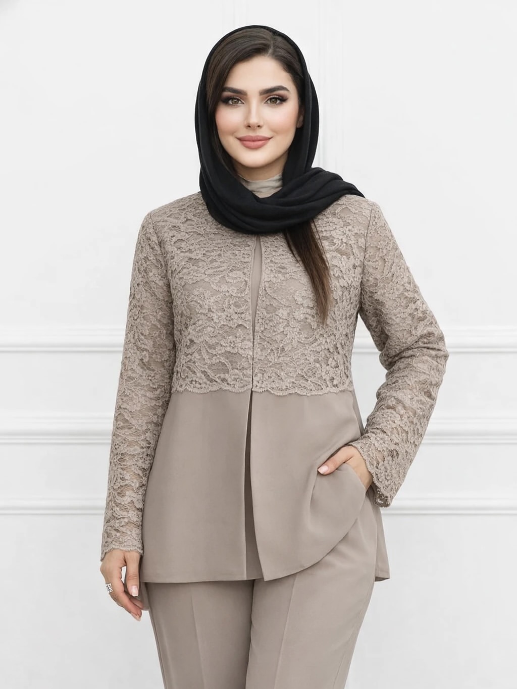 ناموجودکت و شلوار ززنانه مزونی با چرخکار گیپور شیک